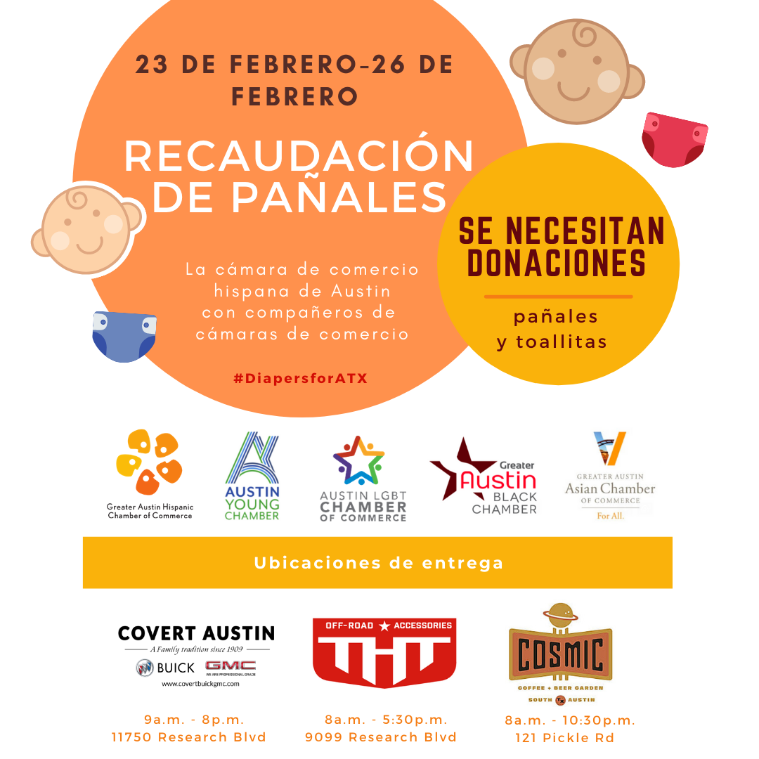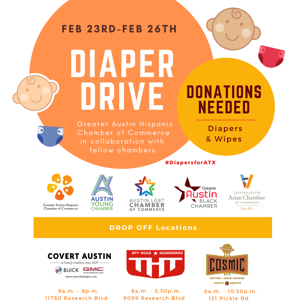 AUSTIN, TEXAS – The Greater Austin Hispanic Chamber of Commerce, in partnership with the Multi-Ethnic Chamber Alliance (MECA) and the Austin Young Chamber kicked off a week-long diaper drive today - #DiapersforATX. The diaper drive will run until Friday, February 26th, 2021. The public is invited to drop off diapers of any size and wipes in collection boxes at the following locations during business hours: